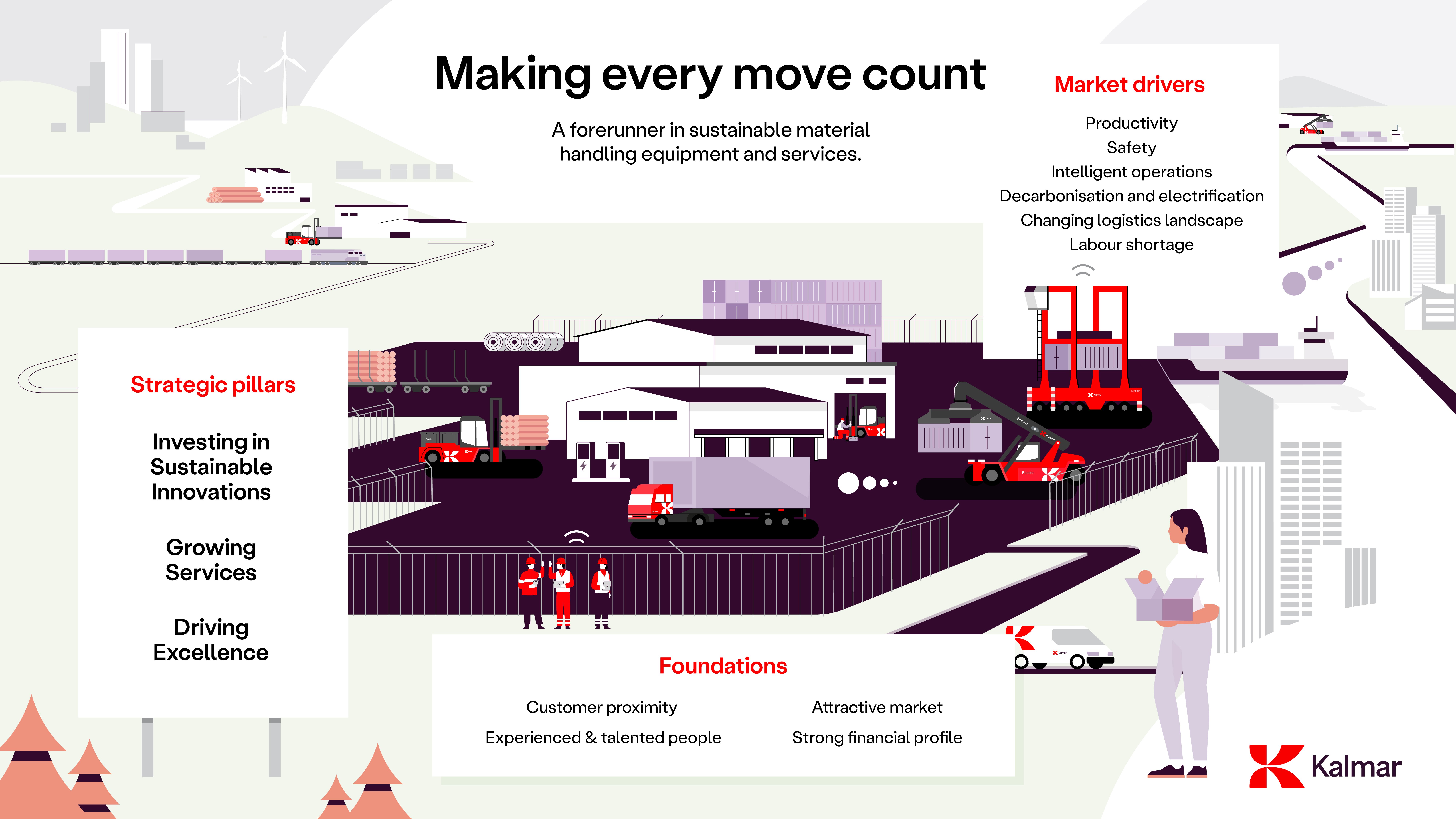 The logistics industry is transforming to meet the challenges of our world. At Kalmar, we are at the cutting edge of this transformation. With our global reach, we are driving sustainable material handling, creating value for our shareholders, and helping our customers improve their safety, sustainability, and productivity. Together, we’re making every move count.